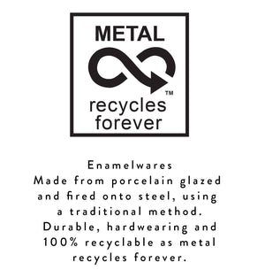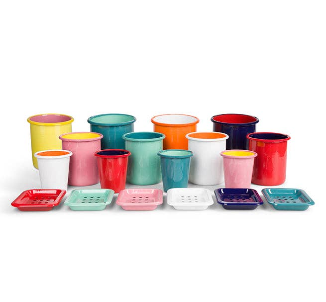 A classic enamel Utensil Holder, crafted here in a combination of Sulphur Yellow & Old Rose, two key colours that work beautifully together from our archival BRITISH COLOUR STANDARD Dictionary. An ideal piece for the kitchen or bathroom, its ideal size and weight make it perfect for loading up with spoons, spatulas, brushes etc. it won't topple over! The item is gift-boxed in a neat, recyclable kraft card box. Traditionally made Enamelware is incredibly durable, with the colourful ceramic -style 'glazed' coating fired onto the metal piece. The utensil holder measures 14cm D x 15 cm H (5.5" D x 6" H) and weighs 465g. To care for it, try to avoid chipping, do not use abrasive pads/cleaners, and do not place in a microwave or freezer. It's domestic dishwasher safe. Note: Enamelware Production These are handmade items, so slight variations can occur with painted edges etc. When the colour pigment is fired on, sometimes tiny black dots can appear on the item surface; these dots are from the metal wires used to