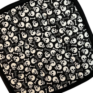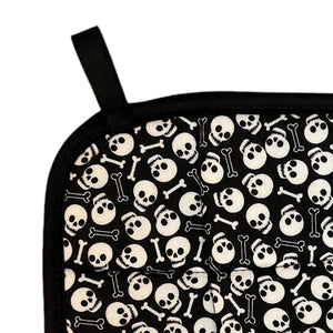 This black pot holder, adorned with crisp white skulls, brings a touch of rebellious flair to your kitchen. Perfect for those who love a dash of rock 'n' roll with their cooking. Its durable design keeps your hands protected while adding a bold statement to your culinary adventures.